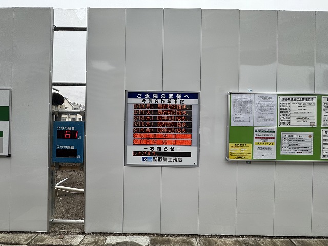 現場の囲いには電光掲示板で工事の週間予定をお知らせしています。