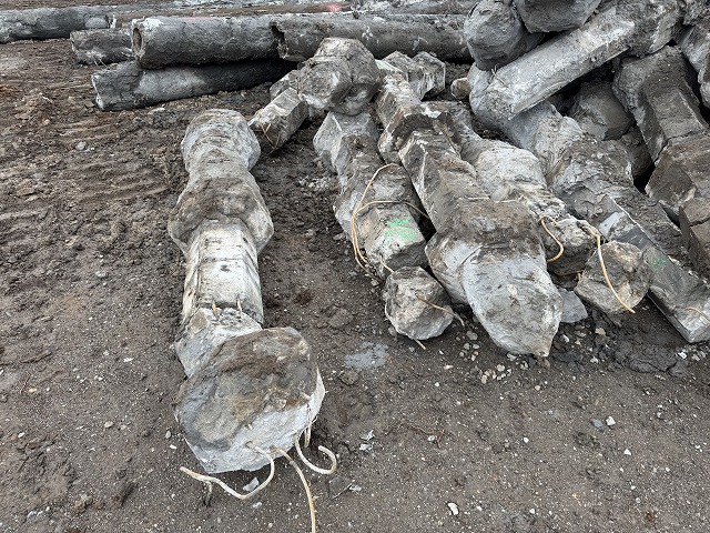 こちらが引き抜いた既存杭です。コンクリート製の杭が撤去されました。
