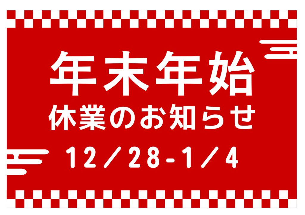 2025/11/01 お知らせ 年末年始の休業日のお知らせ 平素は大変お世話になっております。 誠に勝手ながら、弊社では年末年始につきまして下記のとおり休業とさせていただきます。 2025年12月28日(日)~2026年1月4日(日) ご迷惑をお掛けいたしますが、何卒ご理解のほどよろしくお願い申し上げます。