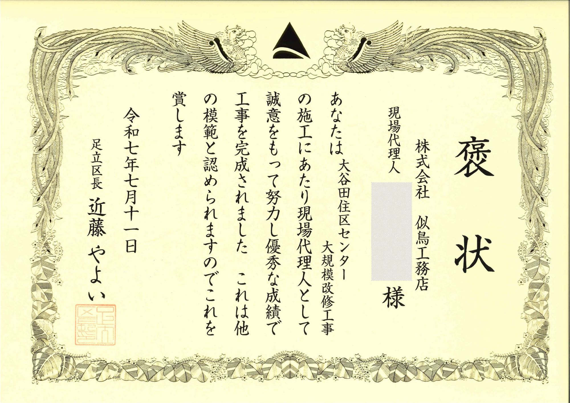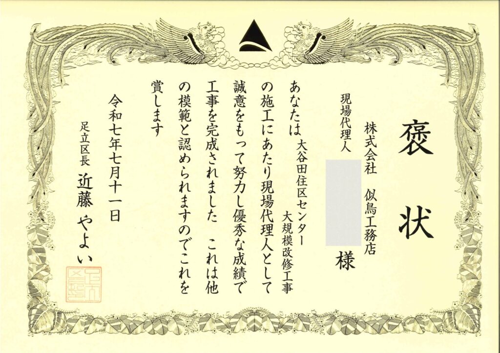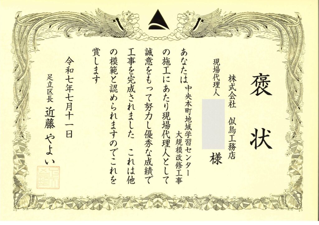 令和7年7月11日(金)の「優良工事施工業者褒状授与式」にて褒状を授与されました。